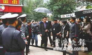 昨日下午2點(diǎn),孫紅雷秘密潛入重慶,在沒(méi)有任何預(yù)兆的情況下,出現(xiàn)在了江北步行街某品牌手表的新店剪彩儀式上。雖然主辦方非常低調(diào),但孫紅雷出場(chǎng)卻很高調(diào)。一身黑衣裝束,不下雨也有專人撐傘,沒(méi)太陽(yáng)也戴著墨鏡。在上千人的圍觀中亮相10分鐘后飄然而去。