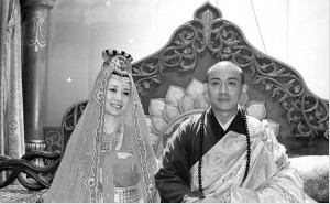 昨日拍攝的主要是唐僧在女兒國的戲份。女兒國國王舒暢身著紅色盛裝手牽唐僧聶遠(yuǎn)登上皇宮寶座,然后兩人并肩坐下,氣氛顯得有些曖昧……