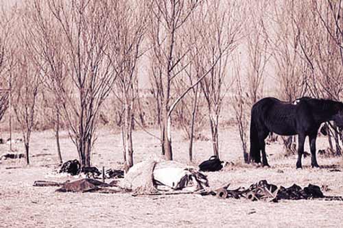 記者6日來到拍攝現(xiàn)場,發(fā)現(xiàn)一大片平整的濕地上異常熱鬧,十多匹高頭大馬正在不停地啃著野生紅柳的樹皮,約30多臺(tái)各種車輛停放在濕地上,地上到處是垃圾和隨手扔掉的黑白塑料袋……