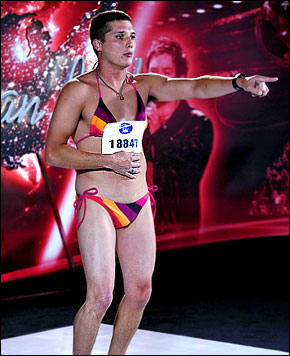《美國偶像》從來不乏惡搞歌手,去年出了個比基尼女孩,今年又出了個比基尼猛男。周二晚,在節(jié)目進行過程中,參賽選手泰·海默靈(Ty Hemmerling)身著比基尼泳衣登臺獻唱,驚得眾評委目瞪口呆。