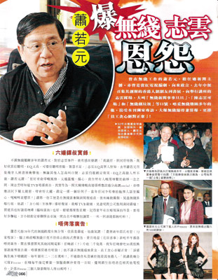 多年來,蕭若元一直不滿無線的壟斷行為。對于陳志云涉貪事件,他有感而發(fā):“我認識他多年,但和他不熟。我很欣賞他的聰明,EQ又高,可惜他聰明有余,智慧不足!标愔驹艵Q高眾人皆知,去年蕭若元召集了20多人在書展上攻擊他,無論別人怎么高喊口號,陳志云仍能鎮(zhèn)定微笑。但蕭若元指出:“陳志云太過濫權(quán)、偏心,作為一個大機構(gòu)的高層,他不應(yīng)該過分高調(diào),也不該和下屬太過親密,那樣會很麻煩。蕭定一就是一個例子,他當(dāng)年和李彩樺拍拖,就被人指偏心!