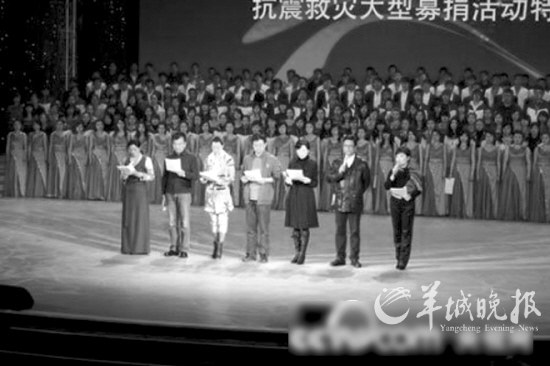 昨晚8時(shí),《情系玉樹 大愛無疆———抗震救災(zāi)大型募捐活動(dòng)特別節(jié)目》在中央電視臺(tái)現(xiàn)場(chǎng)直播,約有300名來自內(nèi)地和港、澳、臺(tái)地區(qū)的老藝術(shù)家、體育明星、戲曲歌唱演員參與演出。與普通的晚會(huì)不同,這次央視將節(jié)目現(xiàn)場(chǎng)與新聞現(xiàn)場(chǎng)串聯(lián),按照震后的時(shí)間順序,穿插救援畫面,再現(xiàn)了震區(qū)每天發(fā)生的感人事件,突出了節(jié)目的紀(jì)實(shí)性。
