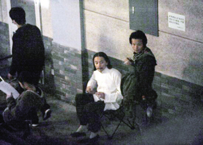 隨后,廖凡、邵兵、張默一一亮相,他們都準(zhǔn)備化妝拍戲,廖凡和張默留著鍋蓋頭,一看似乎就是下級土匪,而邵兵留著平頭和兩撇細細的小胡子,看上去可能是一個“中隊長”式的角色。雖然廖凡也留著小胡子,但他的胡子卻顯出一股“兇氣”。
