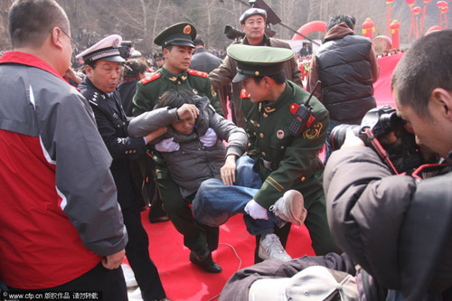 下午1時(shí)50分左右儀式開(kāi)始,陳凱歌上臺(tái)發(fā)言后,在場(chǎng)圍觀民眾為爭(zhēng)看明星開(kāi)始出現(xiàn)擁擠,約300民眾涌上一個(gè)高約一米、專為記者拍攝而設(shè)的木制看臺(tái)。大約三分鐘后,看臺(tái)疑不堪負(fù)重,突然倒塌。在前排拍攝的記者如滾地葫蘆般墜地,三角架、攝影機(jī)倒地?fù)p毀。在場(chǎng)的公安、武警將受傷的10名記者抬離現(xiàn)場(chǎng),送院救治。