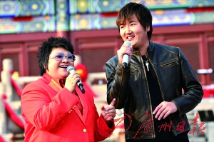 太廟前,韓紅特意一身戎裝亮相,英姿颯爽。她首先抱著吉他走上太廟階梯,以高亢細(xì)膩的嗓音演唱了具有國(guó)際性音樂(lè)元素的《聽我的聲音》等歌曲,而最后一首西藏風(fēng)格的《歸來(lái)》則請(qǐng)三寶親自指揮。