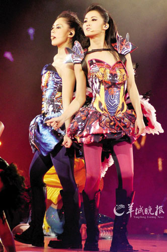 前晚的演唱會場面相當華麗,TWINS一共換了五套華服,每套都以不同的主題場景配襯,絕對凸顯“女人味”。一開場,兩人以“冰雪女王”的科幻裝束亮相,取“破冰重出”之意;接著是“小蜜蜂”昆蟲造型,寓意“辛勤勞作望有所獲”;然后是“絢麗大花”小短裙,顯示兩人如花般“美麗綻放”;還有“芭比娃娃”俏麗打扮,取意“依然經典可愛”;第五套服裝是夸張“鹿角”配黑白短裙,在《下一站天后》的歌聲中再次展開對“天后夢”的追逐……直到返場時,她們才換回樸素的灰色短裙,裙子上印著她們此次演唱會各自的造型,似乎又回到了現(xiàn)實。