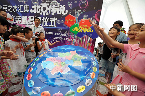 “北京之水匯集北京傳說(shuō)”活動(dòng)是圍繞北京兒藝六一大戲《北京傳說(shuō)》中的節(jié)水環(huán)保主題而開(kāi)展的、面向北京所有小學(xué)生及學(xué)齡前兒童的大型環(huán)保節(jié)水公益行動(dòng)。現(xiàn)場(chǎng)12位節(jié)水小明星代表一起把他們從北京各水系取來(lái)的水標(biāo)本匯集到“北京之水”大型環(huán)保容水裝置中,這一裝置高1.5米,它以藍(lán)色水波紋狀物體為底座,上方圓弧狀轉(zhuǎn)盤中用顯著顏色標(biāo)識(shí)出北京水系分布情況,5月28日至6月1日《北京傳說(shuō)》演出期間,該容器將放置在水立方場(chǎng)內(nèi),成為一道環(huán)保新景觀。