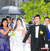 昨早9時男方以6輛奔馳車隊至女方家迎娶,親友幫新娘撐的卻是黑傘,依民間習俗,一般新娘出嫁時,親友會以米篩遮陽,如果是撐黑傘,多半意味新娘腹中有喜。問新人是否有喜時,他們只說“謝謝”,未正面回答。證婚人鳳凰衛(wèi)視主席劉長樂入場時,被媒體問:“小孩是男的?女的?”他也未作答。