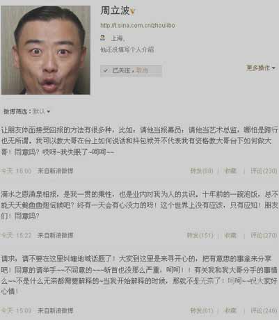 采訪首先圍繞關(guān)周分手。周立波說(shuō):“我很無(wú)辜,老關(guān)也很無(wú)辜,有人在中間挑事,我們會(huì)查的!彼嬖V記者,知道媒體“踢爆”兩人分手一事時(shí),他正在與前紐約警察局華人局長(zhǎng)莫虎一起喝酒,而當(dāng)天下午他剛在無(wú)畏號(hào)航母上看了“珍珠港事件”的紀(jì)錄片,當(dāng)時(shí)他的第一個(gè)反應(yīng)是“沒(méi)想到我也遇上珍珠港事件了”。由于當(dāng)時(shí)認(rèn)為是關(guān)棟天向媒體“踢爆”此事,而且當(dāng)晚酒喝得比較多,因而在微博上寫下了幾段很有爭(zhēng)議的博文,包括“泡飯鮑魚”說(shuō)!敖Y(jié)果阿春(孫徐春)用人格向我擔(dān)保決不是‘老怪頭’(周立波和孫徐春對(duì)關(guān)棟天的昵稱)說(shuō)出去的,我相信他!敝芰⒉ū硎荆舜畏质种皇撬囆g(shù)和商業(yè)上的分手,兩人的藝術(shù)觀點(diǎn)不同。