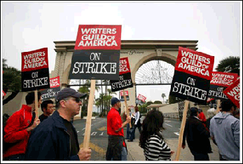最近,洛杉磯真是不太平。不久前,山林大火燒了一個(gè)多星期,至少造成15億美元的損失。本月5日,好萊塢劇作家們又在工會的領(lǐng)導(dǎo)下,開始在全美國罷工。這是20年來的第一次劇作家罷工,在美國各界引起相當(dāng)大的反響。這些平日深鎖家中爬格子,難得露面的好萊塢劇作家們,一大早聚集在八大影業(yè)公司以及迪斯尼總部的攝影棚外,他們高舉標(biāo)語牌,聲稱這次對“電影暨電視制作人聯(lián)盟”展開的罷工,將會是一場持久而代價(jià)昂貴的行動(dòng)。電視屏幕上馬上就有了反映,一些電視臺開始播放老舊的內(nèi)容。當(dāng)然,作為同行,演員、主持人、脫口秀主持都非常支持編劇們,到現(xiàn)場慰問,并且在自己的節(jié)目中聲援罷工。