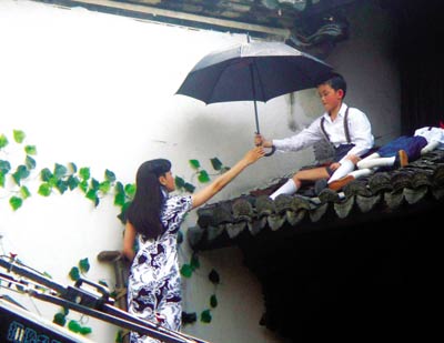 昨日的一場戲,是秦嵐和劇中的兒子吳磊拍對手戲。由于天氣炎熱,秦嵐說雖有洋傘遮陽,但妝還是化得很快。小演員吳磊當(dāng)天很是不適,拍到最后竟然中暑,又吐又哭,忙壞了劇組的工作人員。按照劇情,秦嵐要從屋頂上往下跳,盡管劇組為她請了替身,但為了追求真實和進(jìn)度,秦嵐親自上陣,從數(shù)米高的地方往下跳,這場戲總算結(jié)束。