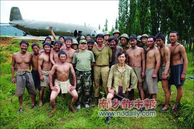 “經(jīng)過了171天,我宣布《我的團(tuán)長我的團(tuán)》(簡稱:團(tuán)長)今天關(guān)機(jī)!”昨天,在昆明滇池附近,《團(tuán)長》拍完了最后一場戲。在場演員張國強(qiáng)、張譯、高峰、羅京民等在那刻高聲歡呼,相互擁抱。他們個(gè)個(gè)像從泥土中爬出來的,破衣爛衫,灰頭土臉,卻神采飛揚(yáng),所有的人最大的愿望便是去洗個(gè)熱水澡。而在拍攝的最后一天,歷經(jīng)磨難的《團(tuán)長》也首次向媒體開放現(xiàn)場,記者探班了該劇的最后一場戲:“炮灰團(tuán)偶遇日本兵”。這場戲雖然是在最后一天才拍,卻是發(fā)生在前面的一個(gè)片斷,確切地說,這是第3集第29場戲。這個(gè)時(shí)候戰(zhàn)爭剛剛開始,主角們的身體尚未殘缺。他們乘飛虎隊(duì)的C46運(yùn)輸機(jī)被日本軍隊(duì)襲擊,被迫降在緬甸。此時(shí),炮灰團(tuán)遇到了日軍,第一個(gè)日本兵誤認(rèn)為他們是緬甸反英武裝,迷糊中被迷龍(張國強(qiáng)飾)干掉。后面日軍沖來時(shí),迷龍帶頭逃跑,槍彈炸藥聲四起。這場戲中,日軍拿著10來?xiàng)l真槍,背景是被炸毀巨大C46運(yùn)輸機(jī)。