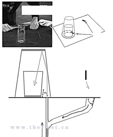 網(wǎng)友分析:在這個(gè)魔術(shù)中,我們可以注意到,大杯與小杯中間仍有縫隙,大杯是倒著放的,小杯則是正立著套在大杯里的。黑色的桌布主要是為了掩飾從桌下彈射硬幣的出口。在表演時(shí),劉謙攥著硬幣的手曾一直放在桌子的左下角,其實(shí)那里正是硬幣進(jìn)入的地方。經(jīng)過(guò)桌下的機(jī)關(guān),硬幣順勢(shì)滑到杯子下方。觀(guān)眾們看到的是硬幣從小杯子與大杯子間的桌面射進(jìn)大杯然后被大杯壁和大杯底2次反彈后落入小杯中的。經(jīng)推斷,劉謙應(yīng)該還在桌子某個(gè)位置布置了一個(gè)彈射硬幣的機(jī)關(guān),從而讓硬幣從桌布下面射出來(lái)。