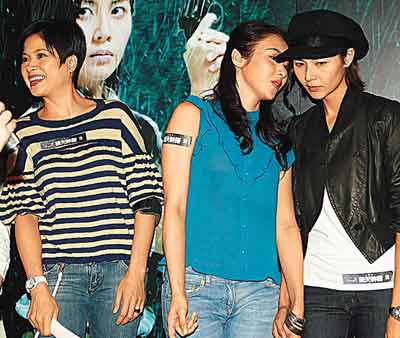 中新網10月17日電 鄭伊健新舊戀人蒙嘉慧和邵美琪昨日公開碰頭,二人沒有正面交流,在臺上合照時分別站在黎姿左右,蒙嘉慧突然與黎姿姊妹情深,手拖手耳語,但亦難掩尷尬神色,相反見慣風浪的邵美琪則沒有理會蒙嘉慧,在活動完畢后即箭步離場。