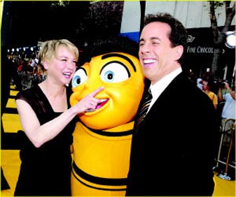 10月28日晚,洛杉磯西木區(qū)的曼恩鄉(xiāng)村劇院成為“蜜蜂”的世界,一輛輛漆成黃底黑條的甲殼蟲汽車停在劇院外,走下車的是好萊塢女星蕾妮•齊薇格和喜劇明星杰瑞•宋飛,在同樣黃黑相間的地毯另一端,一只巨型大蜜蜂卡通玩偶早已恭候多時(shí),動(dòng)畫新片《蜜蜂總動(dòng)員》首映就這樣熱鬧登場了。