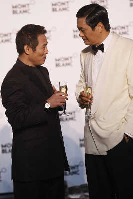 在臺下,昨天周潤發(fā)和李連杰幾乎“零交流”。萬寶龍老總在臺上致辭時,周潤發(fā)夫婦、李連杰以及李冰冰都在場下等候。周潤發(fā)與眾老板相談甚歡后,即轉身與李冰冰交談,不時還手舞足蹈一番。而李連杰一直低調地站在后排,身材不高的他被人群淹沒。只見李連杰時而與身邊的老外簡單攀談幾句,時而低頭看著腳下發(fā)呆。兩位巨星在臺下始終沒有交流,連對視都沒有,唯一一次交流只是在臺上寒暄幾句。