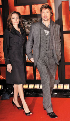1月7日,茱莉和皮特出席影評(píng)人選擇獎(jiǎng)時(shí),出人意料沒(méi)有穿性感晚裝出場(chǎng),有遮掩凸起小腹之嫌。