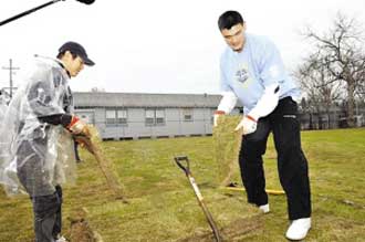 日前,功夫巨星李連杰與中國球員姚明一起出席了美國NBA全明星慈善活動,參加了新奧爾良巨星城的慈善植草皮活動。這個(gè)城市在去年遭受到了“卡特琳娜”颶風(fēng)的襲擊,因此這次的全明星球員們不僅僅只是會去比賽,還會幫助當(dāng)?shù)鼐用駛冏鲆恍┐壬频氖虑。其中中國球員姚明和著名的功夫巨星李連杰也在這些慈善事情中做出了自己的貢獻(xiàn)。圖為李連杰與姚明一起合作植草皮。