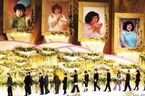 追思會(huì)會(huì)場(chǎng)耗資百萬布置得金碧輝煌,上方是四個(gè)方向的轉(zhuǎn)播屏幕,舞臺(tái)上用金色綢布與香檳玫瑰組成,懸掛著肥姐5張生前各個(gè)時(shí)期的巨幅照片。舞臺(tái)前面寫滿悼詞的牌子林立,悼念排后是一架三角鋼琴,以及寫有“肥姐,我們永遠(yuǎn)想念您”字樣的花圈。而臺(tái)下嘉賓席的正中央,也有數(shù)列座位擺上了整齊的花圈,足足延綿十幾米長(zhǎng)。