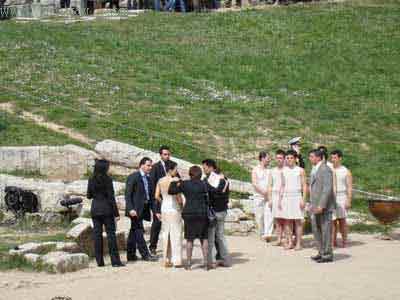 火炬點火儀式于當(dāng)?shù)貢r間24日11:00開始,10:40,章子怡作為第一位中國嘉賓來到了古奧林匹克運動場,頓時得到了在場全體中國人的掌聲和歡呼。她身穿一襲中西合璧的露背白色禮裙,身份卻是記者。儀式結(jié)束后,最高女祭司娜芙普利都和眾祭司正在離開運動場,章子怡見到娜芙普利都,上前打招呼,并和最高女祭司、編導(dǎo)以及眾多女祭司一起合影留念。
