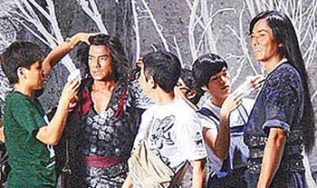 中新網(wǎng)4月22日電 電影《風云II》在曼谷試拍2周,昨正式開鏡,鄭伊健(飾聶風)、郭富城(飾步驚云)一開打就打破頭,只見聶風拿刀朝步驚云的頭砍去,步驚云來不及閃,刀便敲上他的腦門,當下郭富城捂住左額頭痛苦不已,雖沒血流如注,但他額頭已腫如乒乓球大,他搞笑說:“沒關系啦,就算我為迎接奧運,額頭多個乒乓球。”