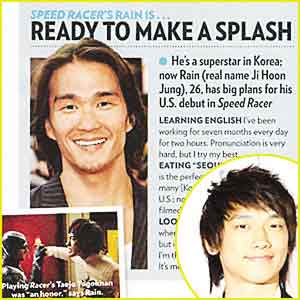 美國演員卡爾·楊最近是春風得意,剛剛主演了沃卓斯基導演的《極速賽車手》不說,還“錯誤地”登上了美國著名的《人物》雜志!度宋铩冯s志的編輯把卡爾·楊誤認為是韓國明星Rain,在照片邊上還配了一段文字:“他在韓國是鼎鼎大名的超級巨星,本名叫鄭智熏,粉絲們都稱他‘Rain’,《極速賽車手》是他投身好萊塢的第一步。” 微特