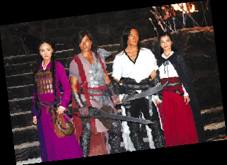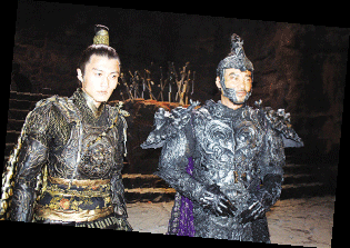 走進(jìn)一間已經(jīng)被布置成刑房的攝影棚,巖石碎塊構(gòu)成了粗糙的地面,幾把劍插成了劍壇,臺階上火爐冒著火苗,空中還懸著幾塊爬著蟲蛆的火腿,幾臺鼓風(fēng)機(jī)正開足馬力吹著風(fēng)……看前面,一堆人正在你推我一把,我攻你一招,原來替身正在幫任達(dá)華試戲。對披著長發(fā)造型的鄭伊健、郭富城以及何家勁來說,炎熱恰是專門跟耍帥作對的。問到郭富城對于造型的看法,郭富城當(dāng)即冒出一句“非常熱”。現(xiàn)場汗流浹背的阿Sa抱怨說,飾演聶風(fēng)的鄭伊健可謂是片中最舒服的一位,不僅戲服相對清涼,由于名為“風(fēng)”,因此拍戲的時候可以充分享受鼓風(fēng)機(jī)的待遇。