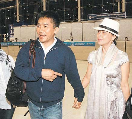 偉仔(左)牽著劉嘉玲抵曼谷機(jī)場,準(zhǔn)新人臉上洋溢幸福。