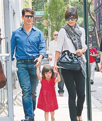 阿湯哥(左起)與女兒舒莉、愛(ài)妻凱蒂在紐約散步,看得出來(lái)瘦了。