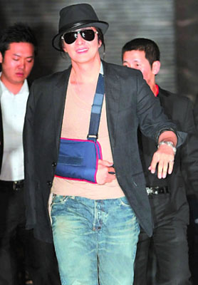 發(fā)表評論  韓國男星裴勇俊之前因為拍劇集《太王四神記》而受傷,本月初接受肩韌帶手術,日前他終于首度公開露面,現身首爾捧老友蘇志燮新片《電影是電影》。戴著墨鏡的裴勇俊雖然包扎著右手,但精神不錯,還和fans揮手。