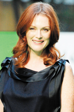 本屆東京電影節(jié)上,《盲流感》的女主角朱麗安·摩爾是唯一的好萊塢星光。本次的東京之行,朱麗安·摩爾鄭重其事,她在開幕式上以黑色禮服出場,在昨天舉行的新聞發(fā)布會上則以桃紅色的低胸晚裝和一套短款的碎花小旗袍亮相!睹ち鞲小繁臼且徊砍林氐碾娪埃禧惏矃s習慣在現(xiàn)場報以俏皮的微笑。一頭紅發(fā)的朱麗安·摩爾在片中那些智慧的笑容、堅毅的神情,讓我們不得不相信那就是生活中的她,而她卻表示:“不管是快樂還是不安,那些都是我!