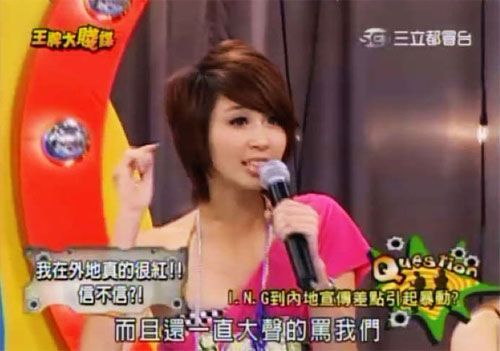 28日,臺(tái)灣綜藝節(jié)目《王牌大賤諜》播出主題為“在外地比臺(tái)灣紅的藝人”訪談。女子組合I.N.G在節(jié)目中公然宣稱(chēng)自己在大陸很紅,并夸張講述大陸歌迷的追星情節(jié),同時(shí)嘲笑大陸的衛(wèi)生習(xí)慣和飲食風(fēng)俗。節(jié)目播出后,大陸網(wǎng)友紛紛表示憤慨,集體攻擊I.N.G論壇和貼吧,并聯(lián)名要求封殺該組合。