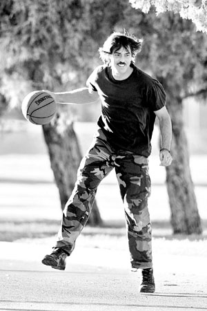 北京時(shí)間今天凌晨,驚悚片《以眼殺人》拍攝間隙,幾名工作人員在離片場(chǎng)不遠(yuǎn)的一個(gè)球場(chǎng)上練習(xí)投籃。穿著迷彩服、軍靴,戴著假發(fā)(他在片中飾演一名秘密特工)的克魯尼也聞聲而至!班耍镉(jì)們,讓我來一個(gè)!”