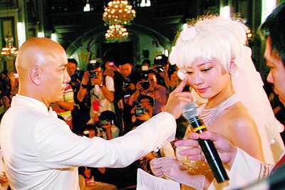 兩點(diǎn)四十左右,婚禮正式開始。在牧師的主持下,張衛(wèi)健和張茜交換了戒指,并分別向?qū)Ψ叫膶⒁簧皇缾壑鴮Ψ,“這個戒指代表了我對你的愛和忠貞!贝藭r,一直在教堂觀禮的雙方親朋好友爆發(fā)出了歡呼聲和掌聲,而兩位新人也是激動非常,張茜更是激動得流下了幸福的淚水。在親朋好友和媒體的見證下,張衛(wèi)健對張茜深情一吻,并雙雙簽署結(jié)婚證書。