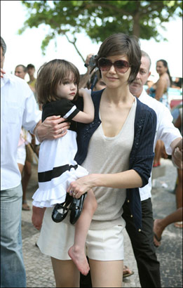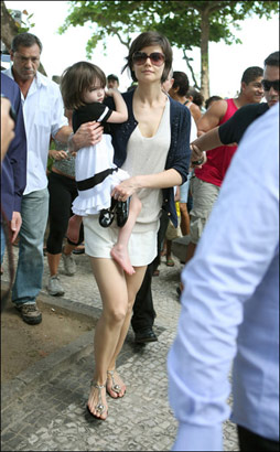 正在巴西度假的凱蒂·赫爾姆斯昨日(2月2日)帶著自己可愛的小女兒在巴西的海灘上悠閑的走著,白色的短褲襯得美腿秀場,藍色的外衣輕巧的抵擋這紫外線的困擾,半臉墨鏡體現(xiàn)非凡氣質(zhì),一雙阿瑟丁·阿拉亞涼鞋提升品味,活脫脫一個高大版的芭比娃娃。而懷中抱著的孩子簡直就是天使降臨,粉嫩的皮膚,配上白色的小裙子,可愛至極。