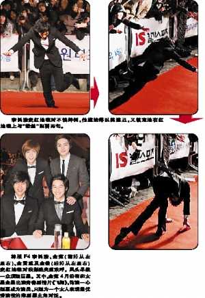 有 “韓國(guó)金球獎(jiǎng)”之稱的第45屆百想藝術(shù)大獎(jiǎng),2月27日在首爾奧林匹克公園舉行,朱鎮(zhèn)模憑古裝愛(ài)情片《霜花店》首次登上影帝寶座,憑《妻子結(jié)婚了》獲頒青龍影后的孫藝珍亦再下一城成功封后。不過(guò),若論風(fēng)頭,眾星就始終不敵《花樣男子》捧紅的韓版F4。四子以一身官仔骨骨的黑西裝走紅地毯,兩旁影迷及傳媒已尖叫不斷,有“粉絲”為見(jiàn)偶像不惜爬上樹(shù)又站上凳子,期間“粉絲”互相推撞,險(xiǎn)釀成意外。把頭發(fā)燙直的“韓版道明寺”李民浩大概是興奮過(guò)頭,走紅地毯時(shí)不慎被階梯絆倒,大出洋相。幸好這一跌跌得有價(jià)值,他擊敗《花》劇中的好兄弟金范捧走電視組別最佳男新人獎(jiǎng),名副其實(shí)“仆倒攞獎(jiǎng)”!李民浩領(lǐng)獎(jiǎng)時(shí)表現(xiàn)激動(dòng),更不介意提及糗事,為紅地毯摔倒一事致歉。至于“韓版花澤類”金賢重就奪得最佳電視人氣獎(jiǎng)。