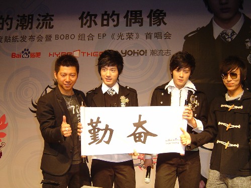 發(fā)布會(huì)宣布了百度與華誼兄弟達(dá)成戰(zhàn)略合作伙伴關(guān)系,接下來雙方將在娛樂領(lǐng)域展開更深入的合作。一批百度的粉絲幸運(yùn)地免費(fèi)獲得了第一期貼紙,而隨著貼紙藝人BOBO組合登臺(tái)表演,會(huì)場的氣氛達(dá)到高潮。BOBO組合攜他們的第一份音樂作品《光榮》EP,首度公開獻(xiàn)唱,而華誼音樂旗下樂隊(duì)組合前輩羽泉、演員羅海瓊也專程到場祝賀百度貼紙發(fā)布。