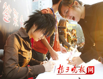 很多玉米都是有備而來,除了相機、海報還帶來了給李宇春的禮物,有玩具、靠墊、掛飾……記者注意到一個小朋友一手牽著媽媽的手、一手抱著一個長長的盒子,到了李宇春面前很禮貌地打了個招呼,李宇春笑著摸摸他的頭,向這對母子說了聲“謝謝”并接過了他們的禮物!拔覂鹤咏衲5歲,他和我一樣也是玉米,春春的《Give me five》、《下雨》他都會唱”,從臺上下來后媽媽和記者聊起來,記者問到禮物,她很認真地說:“是一盒麻花。我們是從天津趕過來的,跟單位請了年假,打算一直在南京待到春春演唱會結束。那是一根長一米的麻花,有寓意的,因為‘一根麻花兩根辮’,春春的新專輯有11首歌,每首歌間都是有聯系的,就希望新專輯像這根麻花一樣……”