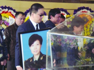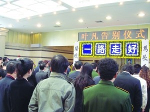 昨天的追悼會現(xiàn)場不但來了很多葉凡生前的好友,也來了不少葉凡生前的戰(zhàn)友,據(jù)武警文工團政委尚力峰介紹,“當聽說葉凡去世的消息后,所有和她合作過的戰(zhàn)友都驚呆了,我們都不知道她的病情居然那么嚴重,她沒告訴我們,是不想讓我們操心。∫驗槲渚墓F即將要有幾個大型的演出,所以戰(zhàn)友們不能全來,但他們送上了花圈表示哀悼。葉凡在我們團是出類拔萃的臺柱子,大型晚會不能少了她,她平時對自己要求十分嚴格,對于創(chuàng)作也是一絲不茍。有一次某地發(fā)生洪澇災(zāi)害,葉凡主動請求到一線演出慰問,并創(chuàng)作《真情永遠》。2003年非典時期,葉凡已經(jīng)得病,但她沒有說任何理由,再次主動要求參加創(chuàng)作,并寫出《天使的故事》,讓全團都為之感動。她也多次獲得過文化部一等獎,可以說現(xiàn)在正是葉凡最輝煌的時期,可她卻離我們而去,太可惜了!”