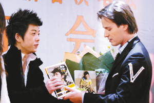 盡管場面沒有上次熱鬧,但是許多歌迷都是從上午接機(jī),一路趕到發(fā)布會(huì)現(xiàn)場。一位楊姓高三女生專門和母親一起從保定趕到北京,為的就是一睹Vitas的風(fēng)采。其母親告訴記者,自己非常支持女兒,甚至連自己也喜歡上了Vitas。曾以一曲《歌劇2》征服聽眾的快男王櫟鑫也來到現(xiàn)場,把自己的唱片送給了Vitas。不過,當(dāng)主持人要求王櫟鑫飆一下高音時(shí)卻被王拒絕了。