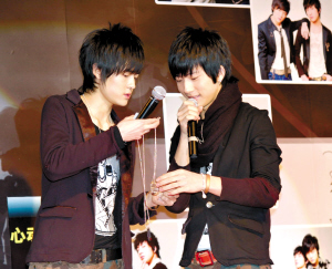 2007年10月22日,由“加油好男兒”的井柏然和付辛博組成的偶像團(tuán)體BOBO組合在北京舉辦了他們的首唱會(huì)。會(huì)上他們不僅載歌載舞與歌迷互動(dòng),還收到了大師兄羽泉組合送來(lái)的禮物。 中新社發(fā) 一可 攝