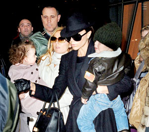 “時(shí)髦辣妹”維多利亞·貝克漢姆緊隨其后。黑風(fēng)衣、大墨鏡、黑帽子——帽檐兒壓得很低幾乎看不到她的眼睛,臉上不帶絲毫笑容。不過(guò)她懷里抱著一個(gè)小孩——小兒子克魯茲,這個(gè)小家伙也穿著黑色皮衣,他好奇地打量著歡呼的人群,一臉茫然。