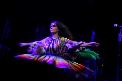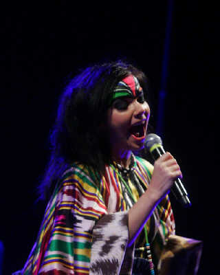 隨著去年發(fā)行的新專輯中主打歌《Earth Intruders》的音樂響起,比約克赤腳登場,身上的服裝并不是此前在香港曝光過的那套“七彩唐僧裝”,而是一套新專輯封面照的真人版———紅黃藍綠的五彩大擺裙、緊身打底褲,那雙光著的大腳在現(xiàn)場藍色燈光的映襯下,呈現(xiàn)出一種略帶鬼魅氣息的熒光藍。簡單的舞臺上空飄蕩著的五彩布上畫著各式動物圖案———癩蛤蟆、蜥蜴以及咸魚;舞臺右側(cè)是她此次巡演備受矚目的女子銅管樂手們,人人頭上都插著紅色的旗幟。一曲唱罷,比約克興奮而干脆地用不標(biāo)準(zhǔn)的中文大聲說,“謝謝!”夾雜著觀眾中此起彼伏的口哨聲、掌聲和些許撕心裂肺的吼叫聲,現(xiàn)場從一開始就預(yù)示著即將到來一場回歸原始本能的熱情。