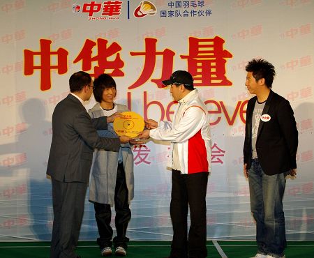 中新網(wǎng)3月21日電 中國國家羽球總教練李永波和內(nèi)地著名歌唱組合羽•泉,聯(lián)手演唱的《中華力量 I believe》在京首次公布,這是聯(lián)合利華旗下中華牙膏品牌為中國國家羽毛球?qū)φ鲬?zhàn)二零零八奧運會而打造的歌曲,F(xiàn)場,國家羽毛球隊出征08倒計時牌也同時啟動。