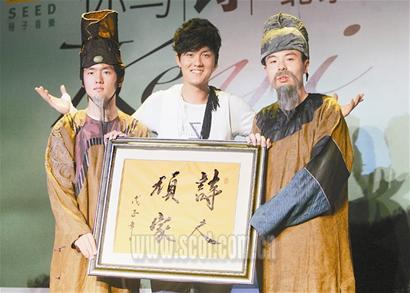因?yàn)榕c“詩(shī)”有關(guān),在昨日的發(fā)布會(huì)上,最先上場(chǎng)的不是主角吳克群,而是“穿越時(shí)空”前來(lái)捧場(chǎng)的中國(guó)古代先賢:最著名的大詩(shī)人“李白”、“杜甫”。在現(xiàn)場(chǎng)所有人的驚呼聲中,兩位年輕演員所扮演的大詩(shī)人,卻顯得心神不定,他們鋪墊說(shuō):“得知今天有一位學(xué)貫古今、又能寫(xiě)詩(shī)、又能唱歌的當(dāng)世才子即將到來(lái)!边@時(shí),吳克群才現(xiàn)身,并為兩位詩(shī)人解開(kāi)了疑惑,還慨然應(yīng)允“李白”、“杜甫”來(lái)考驗(yàn)他,即興將兩位詩(shī)人的名句用吉他彈唱出來(lái)。吳克群的才華讓兩位“先賢”頻頻點(diǎn)頭,并當(dāng)場(chǎng)宣布吳克群為“詩(shī)人頑家”并送上金匾。