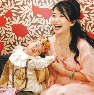 據臺灣聯(lián)合報報道,小寶弟穿上帥氣的王子裝,伸手要他最愛的公主媽媽抱抱,被醫(yī)師評為“長得超快”的頭圍戴不住王冠,不怕閃光燈的他卻不愿配合笑,但媽媽一句“裝可愛”口令,他馬上擠眉弄眼假笑,另一只手還老不自覺地往媽媽胸口抓,急得這孟庭葦猛護胸:“小寶弟,你對媽媽非禮喔!