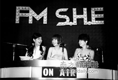 距離上一張《PLAY》專輯已經(jīng)過(guò)了將近1年半,即使唱片市場(chǎng)越來(lái)越不景氣,但《FMS.H.E》的臺(tái)灣預(yù)購(gòu)量還是沖到了4.2萬(wàn)張,讓S.H.E又驚又喜。前日在重金打造的豪華旋轉(zhuǎn)DJ臺(tái)上,身著美麗小禮服的S.H.E三人,不僅聲音悅耳,身材也讓大家驚艷,可惜播報(bào)新聞時(shí)輪流吃了幾次螺絲,把嚴(yán)肅的新聞報(bào)得笑果十足(見右圖)。事后她們?nèi)滩蛔舌?“舞臺(tái)正前方的聚光燈太強(qiáng)了啦,讓我們看不清楚稿子,平常錄電臺(tái)節(jié)目時(shí),并不會(huì)這樣的嘛!