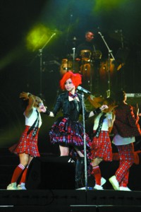張靚穎與生俱來的不僅是她那副“靚嗓”,還有后天難以培養(yǎng)的藝人氣質。能歌的張靚穎昨晚還表現(xiàn)出了善舞的一面,動作的協(xié)調,節(jié)奏的把握,與舞群的配合默契而又出挑,當她帶領著舞群踩著節(jié)拍分別走向舞臺兩側向觀眾致意,頗有大牌風范。而當她戴著一頂紅發(fā),穿著紅色格子短裙亮相時,立刻讓人聯(lián)想到了之前剛在同一場地開唱的日本歌壇天后濱崎步,兩人的造型極其相似,甚至連舞蹈動作都如出一轍。而在演唱新歌《那不是愛吧》時,張靚穎教了場下歌迷一段“手勢舞”,現(xiàn)場氣氛立刻活躍起來,而這也是濱崎步的“專利”產品,早在上世紀90年代,她就開始在演唱會中使用,其實就是電影《浪漫櫻花》中“ParaPara舞”的簡化版。昨晚讓“涼粉”大感驚喜的是,張靚穎竟帶了一個DV上臺,通過高倍變焦就可看清楚臺下歌迷的臉。然而,就在前兩周,凱莉·米洛的北京和上海演唱會上,凱莉就使用了同樣的橋段拉攏歌迷。昨晚最吸引眼球的還屬吊在半空中的張靚穎“穿著”一條十米長裙的驚艷亮相,其實,這一創(chuàng)意也早在2005年的莫文蔚香港和內地演唱會上就使用過,并由菲拉格慕的設計師親手打造,盡顯大氣華貴。