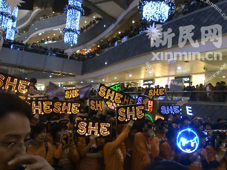 當(dāng)日下午4時許,記者在簽售現(xiàn)場看到,近千粉絲身穿橙色歌迷會會服,高舉燈牌大喊S.H.E的名字,并稱金融風(fēng)暴擋不住S.H.E專輯的大賣。