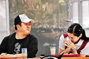 中新網(wǎng)10月22日電 據(jù)《新明日報(bào)》報(bào)道,香港無線電視最近在臺灣為《味分高下》終極篇錄影,昨日在臺北小巨蛋門前拍攝。《獎(jiǎng)門人》主持人曾志偉絲毫不懂憐香惜玉,喝珍珠奶茶時(shí),居然將牛奶茶噴得郭羨妮滿頭都是。郭羨只能強(qiáng)顏歡笑,十分狼狽。
